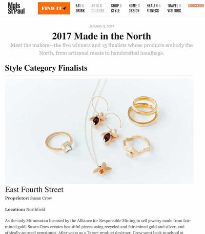 East Fourth Street is recognized as a leader in integrating sustainability into the jewelry design process. Susan Crow (owner/designer) is on the board of Ethical Metalsmiths. Dedicated to creating change, Susan was an early adopter of responsible jewelry practices in 2013, becoming licensed to make jewelry from FAIRMINED gold and silver by the Alliance for Responsible Mining.